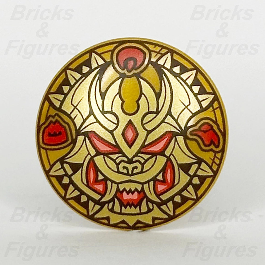 LEGO® Ninjago Gong of Shattering Minifigure Shield Part (Dragons Rising Season 2) Minifig Part. Pearl Gold Shield Circular / Round Convex Face with Gold and Dark Brown Dragon Face, Red and Coral Eyes, Mouth, and Symbols Pattern.