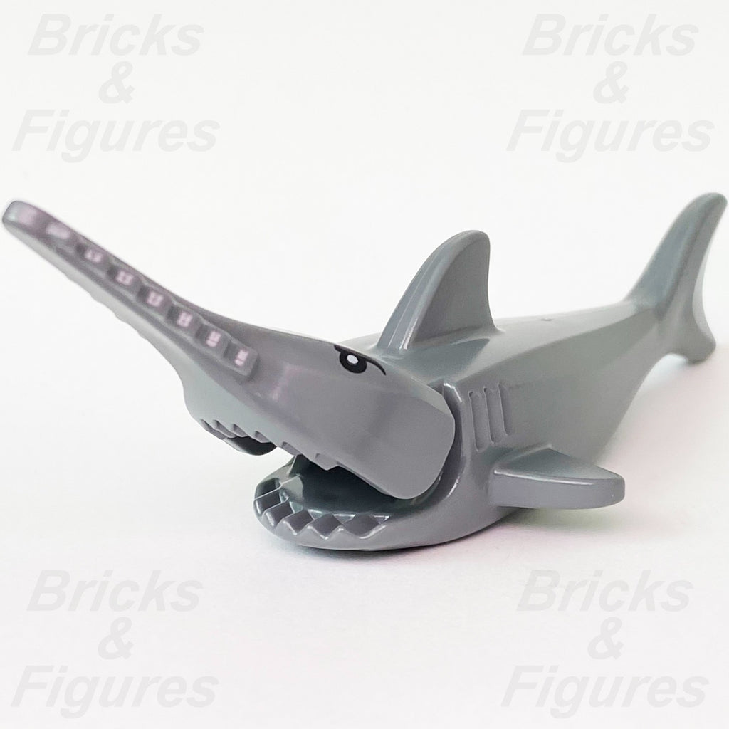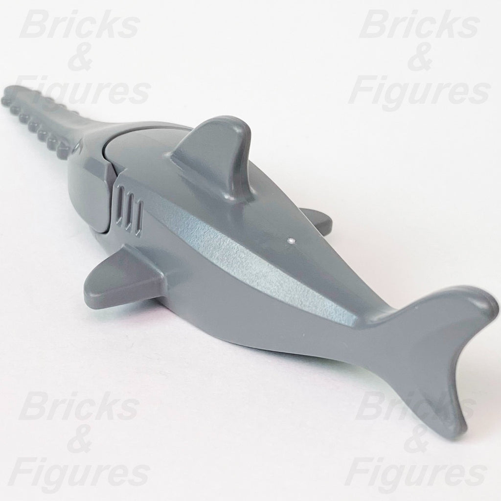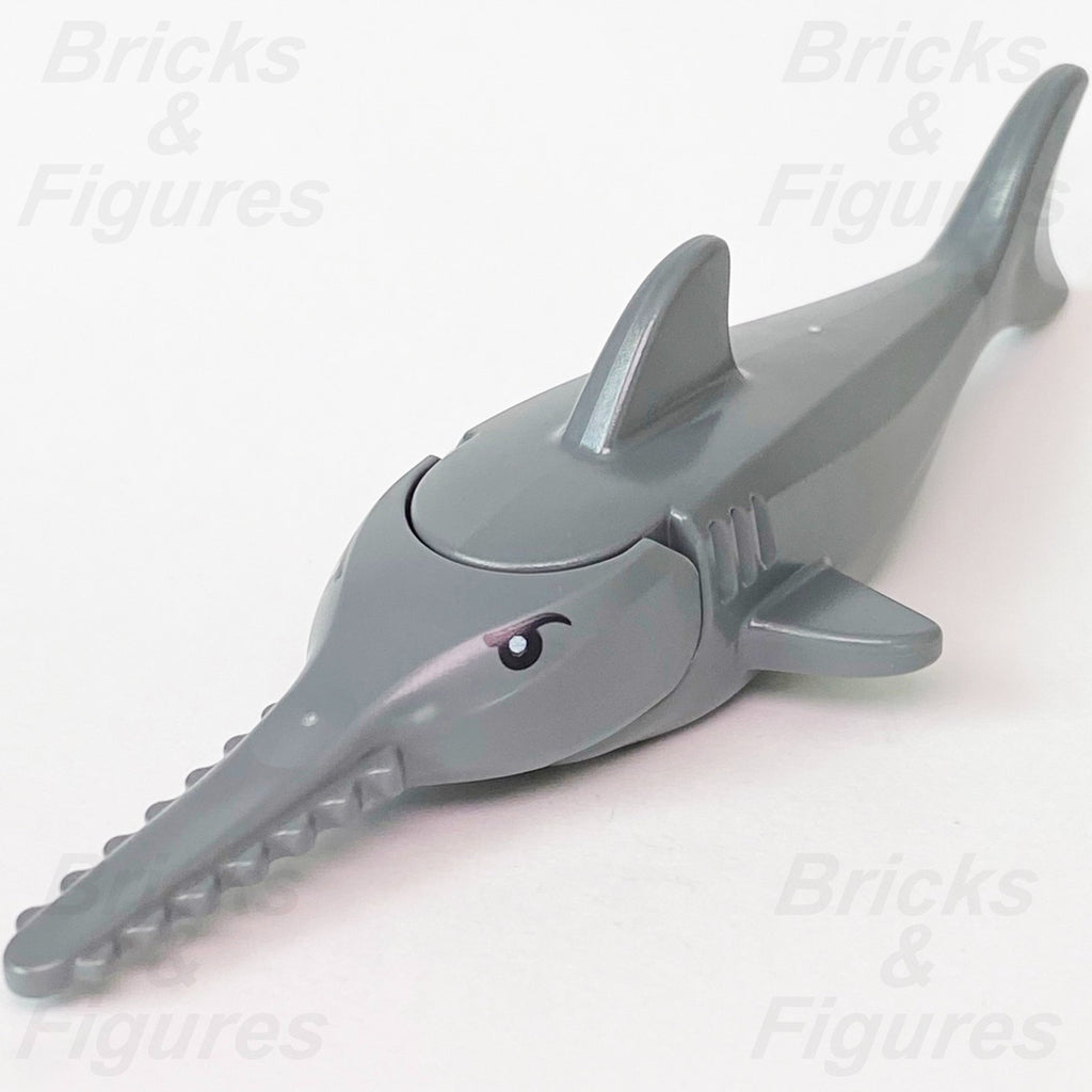 LEGO® City Sawfish Animal Minifigure Part (Deep Sea Explorers, Town). Water Animal, Fish. Part Number 14518c02pb01. Dark Bluish Grey Sawfish with Debossed Gills with Black Eyes with Eyelids and White Pupils Pattern.