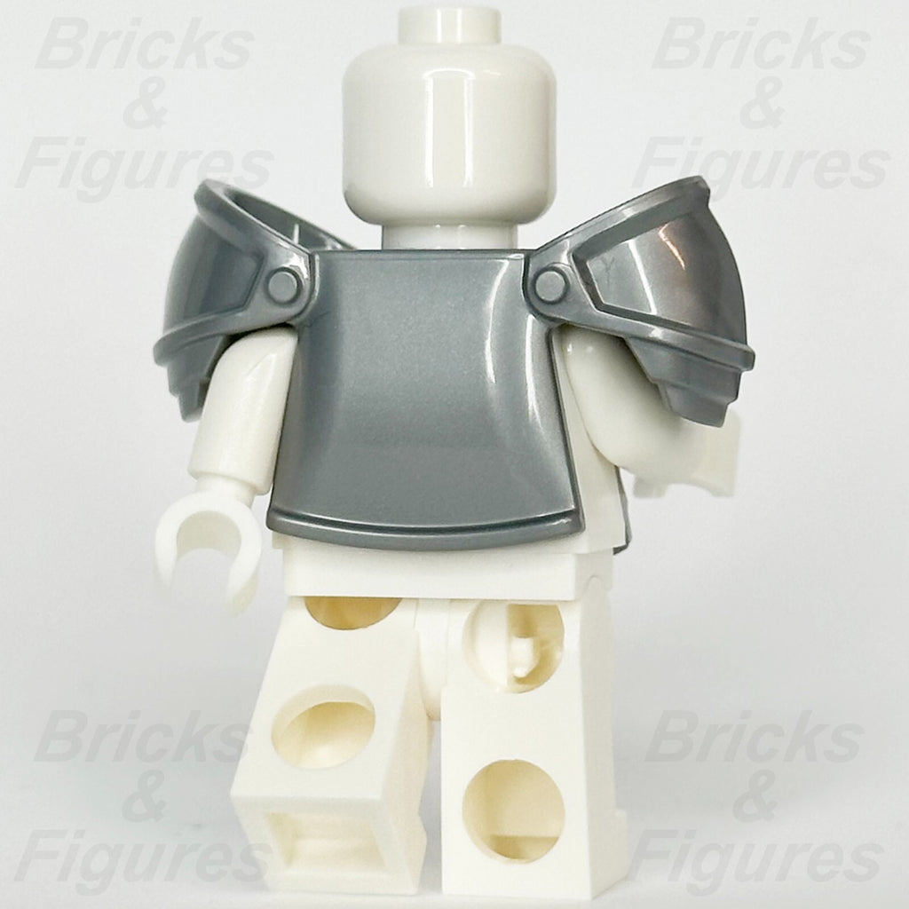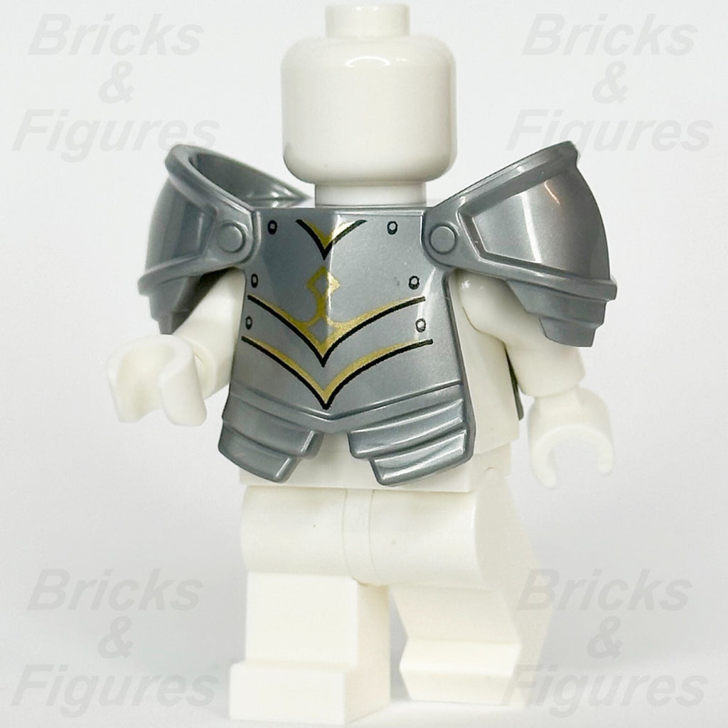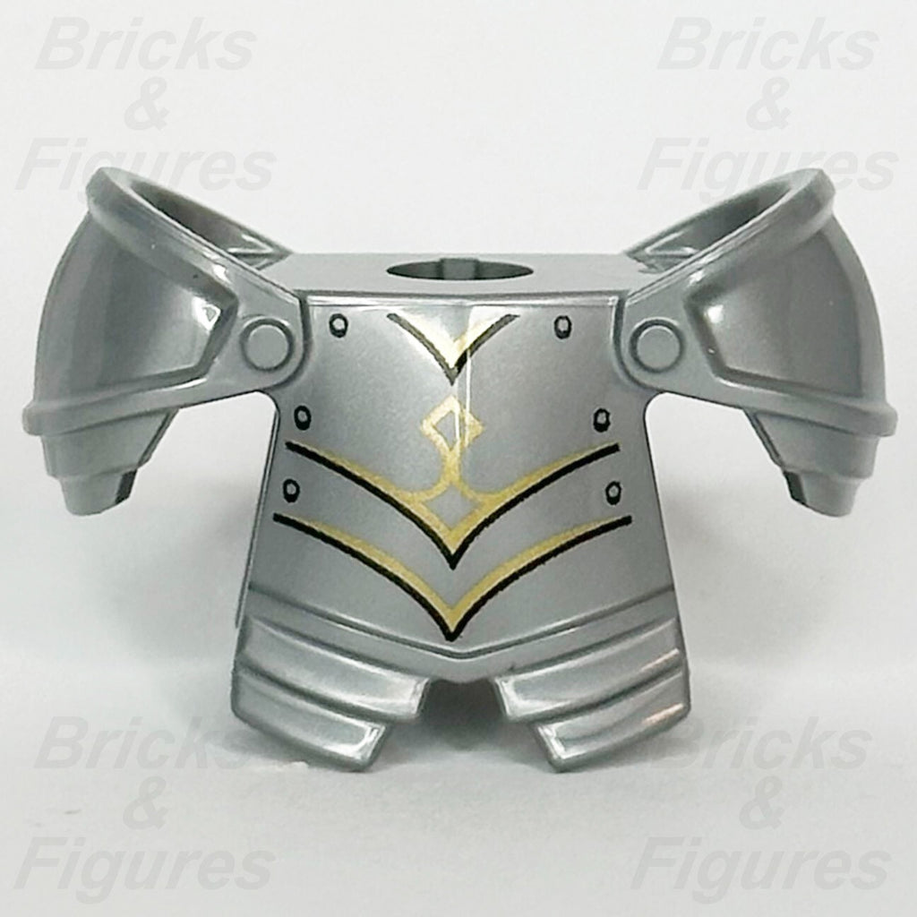 LEGO® Dungeons & Dragons Dragonborn Paladin Minifigure Armour Breastplate Part (Ideas, CUUSOO). Minifig Body Wear - Part Number 5687pb01. Flat Silver Minifigure Armour Breastplate with Leg Protection and Large Round Shoulder Pads with Gold Trim, Black Panel Lines and Rivets Pattern.
