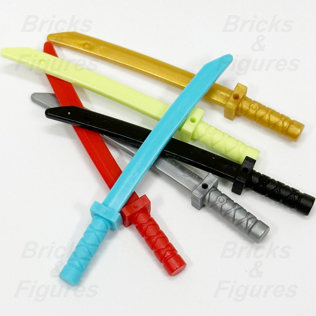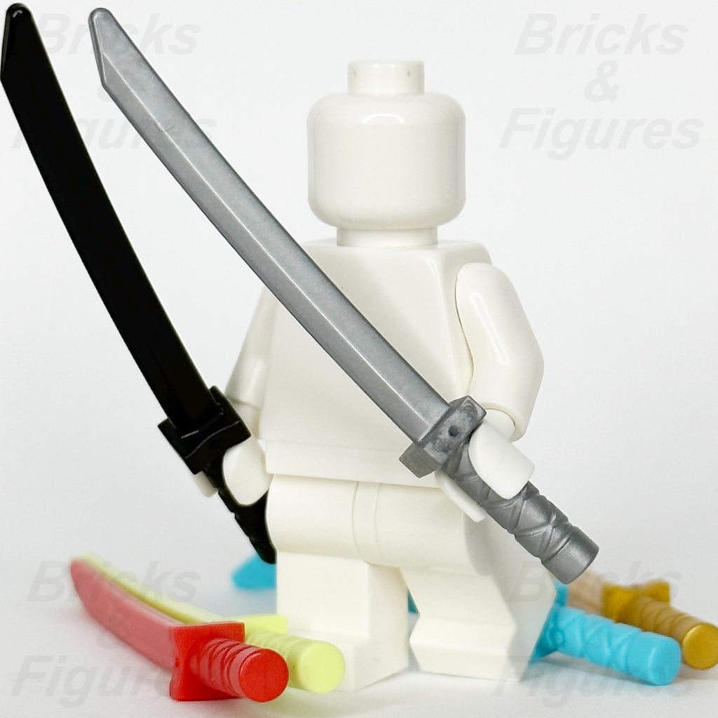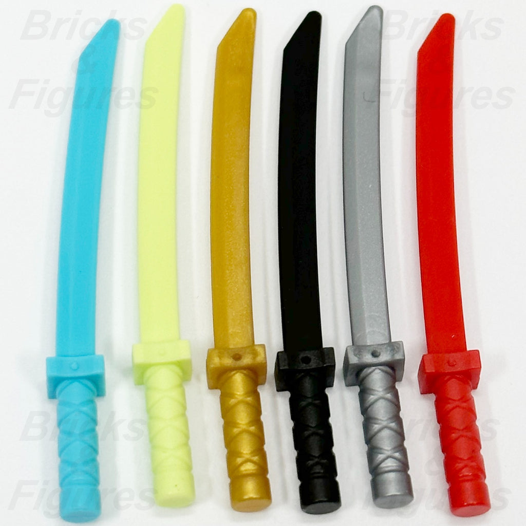 LEGO® Minifigure Katana Sword Weapon Part Pack x 6. Ninja Warrior Blade Accessory for Minifigures. Design ID 21459. Colours Include: Black Katana, Flat Silver Katana, Red Katana, Pearl Gold Katana, Yellowish Green Katana, Medium Azure Katana. Minifigure, Weapon Sword, Shamshir / Katana (Square Guard) with Capped Pommel and Holes in Crossguard and Blade.